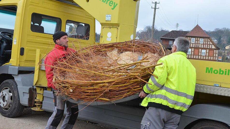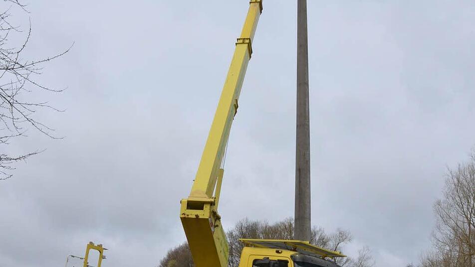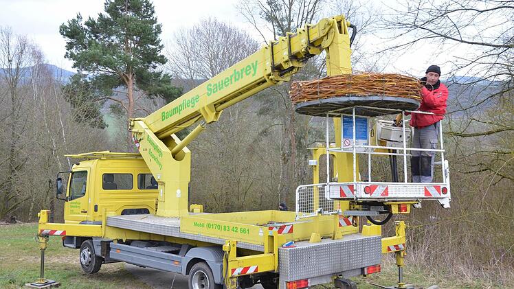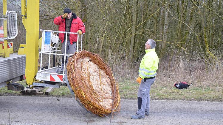 So vorgefertigt lag das künftige Storchennest dann neben dem Sportplatz in Schottenstein. Dort wurde es von Peter Günther und Thomas Fiebich abgeholt. Die beiden arbeiten für die Firma Sauerbrey, die eigentlich auf Baumpflege spezialisiert ist. Aber mit ihrer Arbeitsbühne, die auf 31 Meter hoch fahren kann, sollte sich doch auch ein Storchennest auf einen früheren Strommast heben lassen.