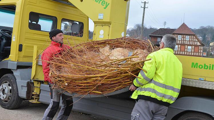 Sich den ausgedienten Strommast zu sichern, war aber nur ein Teil von Wolfs Wohnungsbauprogramm für Adebar. Es musste noch die eigentliche Nisthilfe her. "Ich wusste, dass es in Merlach einen Schmied gibt, der schon so eine gebaut hat für Gemünda", sagt Wolf. Eigentlich wollte er sich nur erkundigen, wie so etwas aussehen könnte. Aber dann bekam er gleich eine gebaut. Das aus Eisen gefertigte Teil hat einen Durchmesser von 140 Zentimetern und wiegt über 30 Kilo.