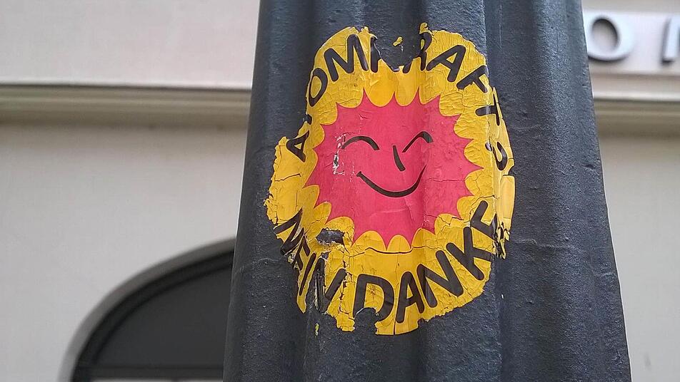 An die bewegten Zeiten der Anti-Atomkraft-Bewegung lange Jahre vor Fukushima erinnert ein Aufkleber, der - längst verwittert - an einem Laternenmast in der Spit überdauert: "Atomkraft, nein danke".