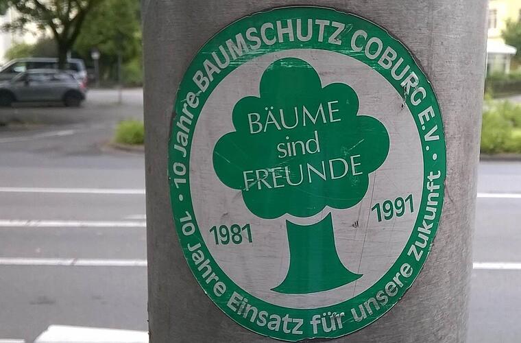 "Bäume sind Freunde" wirbt ein grüner Sticker des Vereins "Baumschutz Coburg", der 1991 sein zehnjähriges Bestehen feierte. "Zehn Jahre Einsatz für unsere Zukunft" lautete damals das Motto. Auch wenn der Verein längst Vergangenheit ist - der Aufkleber überlebt an einem Ampelmast in der Hindenburgstraße bis heute.