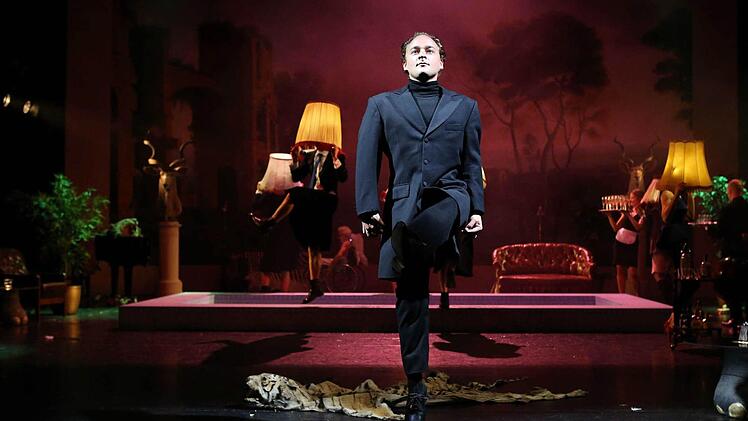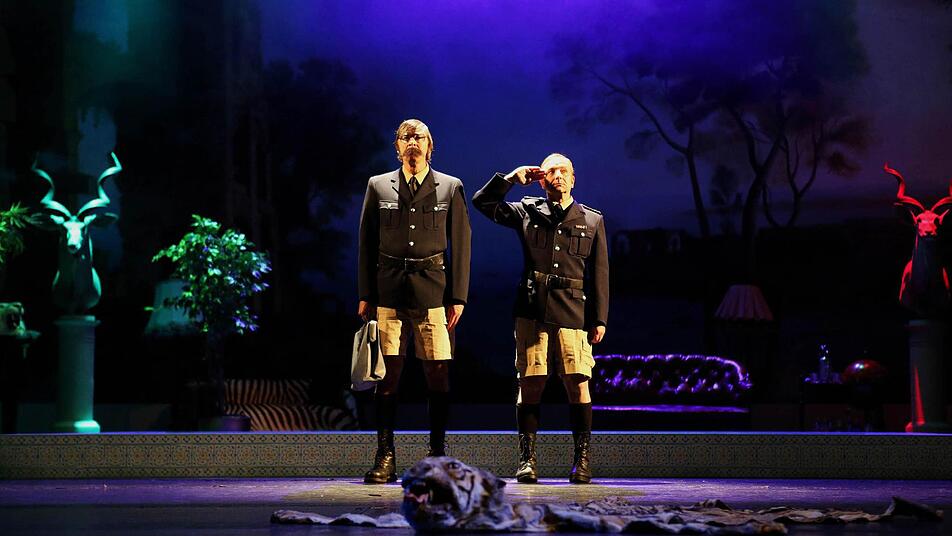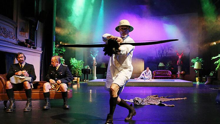 Die exquisite Gesellschaft im männlich markanten Rock - allein dieser Anblick und die nackten Männerbeine in adretten Stiefelchen! - spielt in einem schwülstigen Irgendwo aus angeberischen Großwildtrophäen und sehnsüchtiger Ferne am Horizont, raffiniert eingerichtet von Marie Luise Lichtenthal. Obwohl kaum mal ein Sessel verrückt wird, ist dieser Ort intim belauschend und himmlisch weit und immer wieder anders.