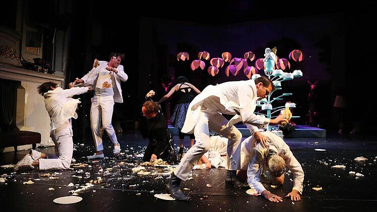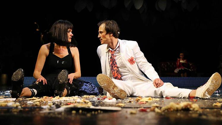 Nicht so immerhin das unglaublich bissige Cousinchen Beatrice und der ihr nach phänomenalen Wortgefechten endlich folgende Benedikt, Kerstin Hänel und Nils Liebscher. Die zwei intrigieren jetzt zurück, auch wenn alle nach wüster Tortenschlacht am glitschigen Boden zerstört sind. Diese zwei Hasslie benden möchte man ja fressen vor (voyeuristischem) Vergnügen am bösartigen Wortgefecht und köstlichen Mienenspiel.