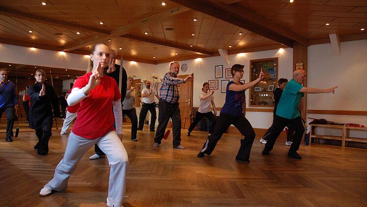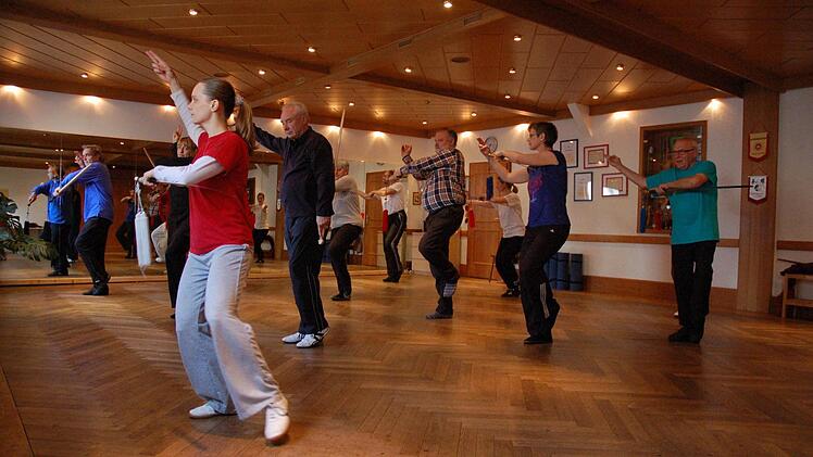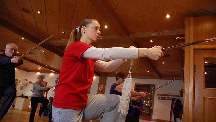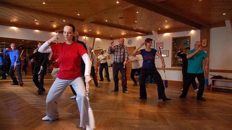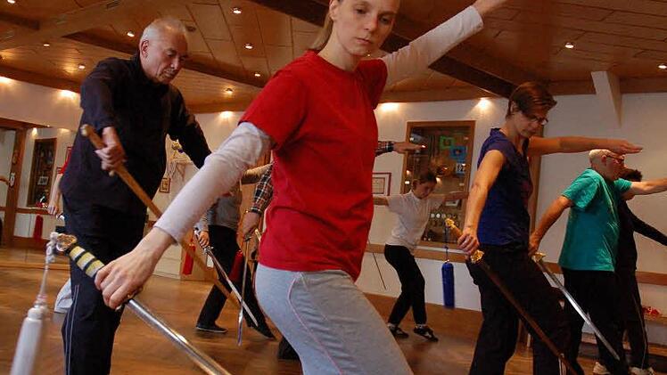 Die Bewegungen sind langsam und konzentriert. Alle im Raum führen schweigsam den exakt gleichen Ablauf der Schritte zum selben Augenblick durch, als würden sie vom selben Kopf gesteuert. Manche haben die Augen geschlossen, führen das Schwert in ihrer Hand wie abwesend und doch sicher. Die Klänge traditioneller chinesischer Musik geben der Szene einen Hauch von Fernost. Die "Schule für Harmonie" liegt aber in Ebersdorf. Ina Packert trainiert hier mit ihren Schülern für die Süddeutsche Meisterschaft im Wushu, die der TV Ebersdorf am Samstag in der Frankenlandhalle ausrichtet.