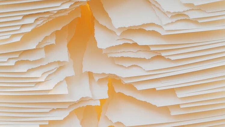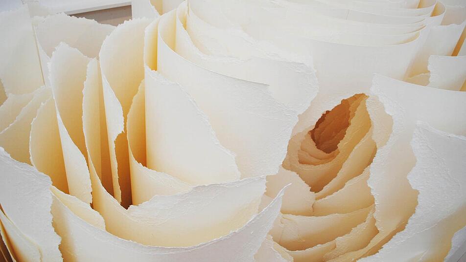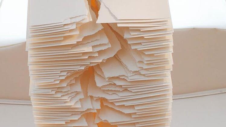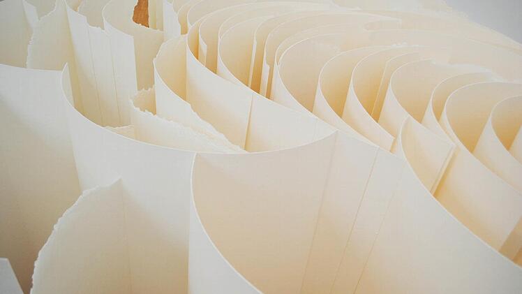 Das ist doch nur Papier. - Sie werden sich wundern. Mehr noch, Angela Glajcars Objekte und Installationen können Schauder der Verblüffung erzeugen. Ihre zigfach gestaffelten Papierbögen, in die lichte, gewundene Höhlengänge führen, setzen neue Räume in den Raum. Sie erschüttern dabei auf sanfte Weise unsere Orientierung, unsere körperliche Sicherheit und Verankerung im Raum. Vor allem, wenn sie in diesem riesigen Format und Arrangement hängen, in der Größe von fünf auf zehn Meter im Kirchenschiff von St. Augustin, in diesem Fall aus zarten Glasgewebe-Bahnen gefertigt und erstmals in Europa zu sehen, oder aus dem Lichtdach im Eingangsbereich des Kunstvereins und ganz hinten in der Rotunde. Die Gebilde führen sofort in andere Gedanken- und Empfindungswelten. Man möchte hineinkriechen in diese leichte, cremeweiße, durch feine Schattenwirkungen lebendige Wolkenhaftigkeit, die gleichzeitig exakt bemessen und konstruiert ist.