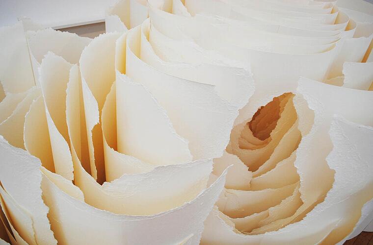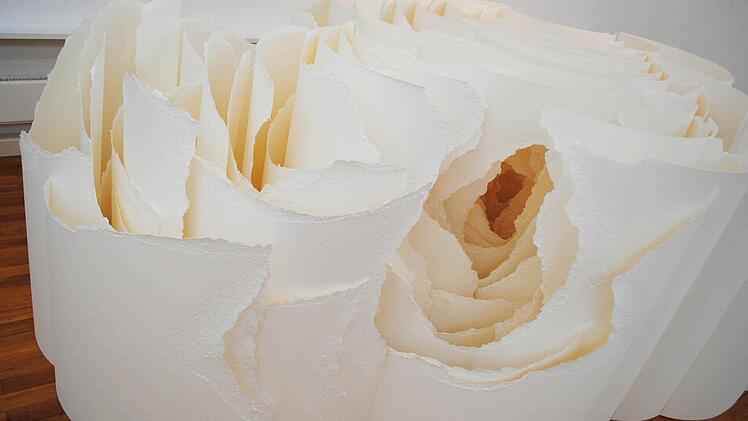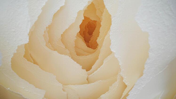 Doch auch die kleineren Objekte haben ihre geheimnisvolle Tiefe. Die Papierbögen, in die variierende Öffnungen gerissen sind, wurden zigfach gestaffelt und führen so aus der Zwei- in die Dreidimensionalität. Außen in exakt geführten Körperformen. Innen in weichwellige, fließende Höhlengänge. In stärker gewundenen, kleineren Skulpturen fügen sich die weich gerissenen Öffnungen im Hinter- und Nebeneinander zu verführerischen Anblicken, als ob man in diese atemberaubenden Rosenblüten blickt, wie sie uns gerade heuer so herrlich üppig beschert sind.