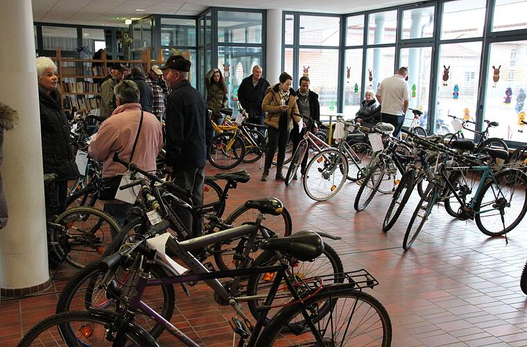 Eine Stunde zuvor ist in der Eingangshalle der Grundschule noch nicht so viel los. Den größten Raum der Halle nehmen die knapp 40 Fahrräder ein. Sie stehen in zwei Reihen. Es gibt Kinderräder, Mountainbikes, ein Rennrad mit dünnen Reifen, klapprige Fahrräder mit Körben, aber auch schwere, robuste Damenräder.