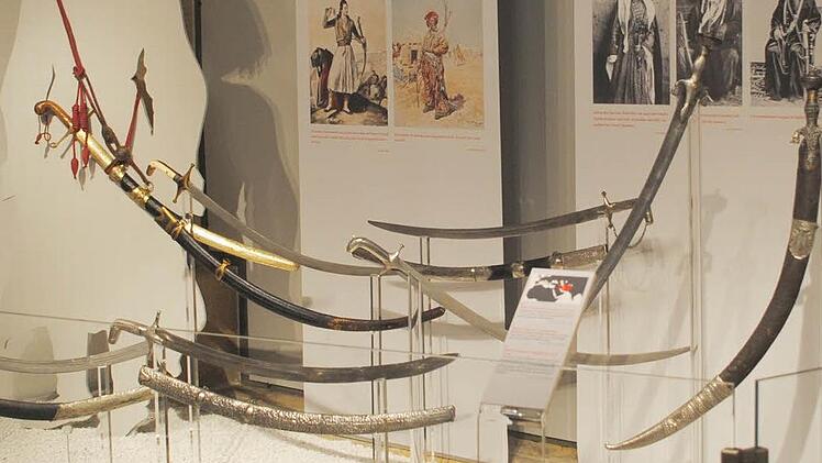 In effektsteigernden Farbhintergründen und anschaulichen Inszenierungen wird regionale Typik deutlich. Die Sammlung Uhlmann ist insofern auch ethnologisch sehr interessant. In Nordafrika war das Dekor der Waffen in erster Linie auf Fernwirkung ausgelegt, wie Geibig erläutert, bei näherem Hinsehen ist die Gestaltung ohne größeren Aufwand erstellt. Bis nach Indien dann wird das Detail immer wichtiger, immer kunstvoller in der Umsetzung.