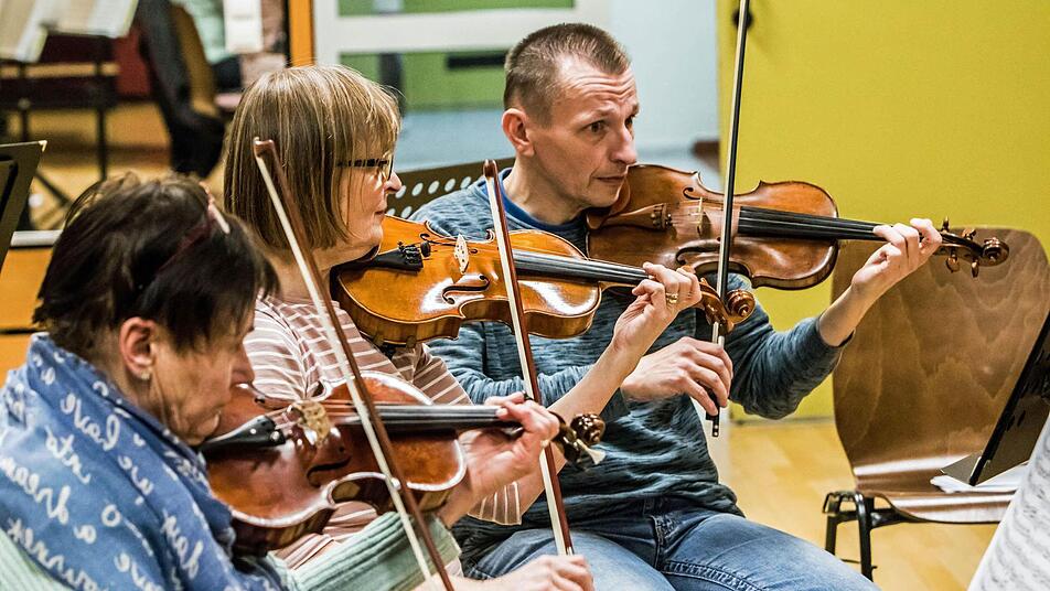 Schließlich sitzen bei der Probe erfahrene Laienmusiker neben echten Profis wie Andreas Rohse, der im Philharmonischen Orchester des Landestheaters Coburg bei den 1. Geigen spielt, oder Dietmar Engels, Solo-Kontrabassist des Landestheaters. Sie alle verbindet die Freude an einer Art von Musik, wie sie sich inzwischen nur noch selten auf Konzertprogrammen findet.