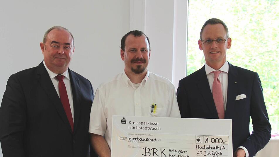 In der BRK-Rettungswache Höchstadt-Etzelskirchen wurden im Beisein von Staatssekretär Stefan Müller (CSU) und Landrat Alexander Tritthart (CSU) Defibrillatoren im Gesamtwert von 30 000 Euro an die 17 Bürgermeister aus dem Geschäftsgebiet der Kreissparkasse Erlangen-Höchstadt übergeben.