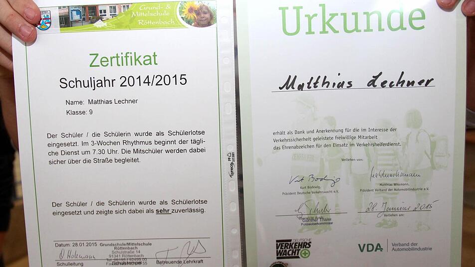Mustafa Muharrem und Justin Franz aus der 7. Klasse haben sich bewusst für den Schülerlotsendienst entschieden. "Wir können Vorbild für die Kleinen sein und den Kindern über die Straße helfen bedeutet für uns auch eine große Verantwortung", erklärt er. Die Ausbildung sei schon teilweise etwas kniffelig gewesen, meinen beide zufrieden, denn sie hatten alles gut geschafft. Nun freuen sie sich auf den Dienst auf der Straße. Im Moment hat die Mittelschule noch keine Probleme Lotsen zu rekrutieren. Aber in zwei bis drei Jahren wird das anders aussehen, denn die Schule leidet an Schülerschwund. "In ein paar Jahren sind wir dann auf die freiwillige Mithilfe von Erwachsenen, den sogenannten Schulweghelfern, angewiesen, dass zumindest die gefährliche Kreuzung an der Hauptstraße abgesichert wird", so der Schulleiter.