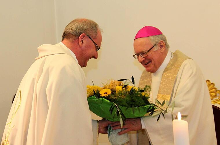 Professor Reinhard Döring an der Sandtner Truhenorgel umrahmte zusammen mit Georg Römer (Sopransaxophon) den Gottesdienst feierlich. Der Dekan bedankte sich beim Alt-Weihbischof für sein Kommen, aber auch bei allen, die in irgend einer Weise mit dem Bau und der Pflege des Kirchleins und der Kita betraut waren und sind, wie der ehrenamtliche Kirchenverwalter Harald Goller. Aber sein Dank galt auch allen, die diesen Gottesdienst mitgefeiert haben. Mit einem Blumenstrauß für den Alt-Weihbischof ging er noch einmal auf dessen wunderbare Predigtworte ein. "Sie waren für uns alle hier eine richtige Befreiungsbotschaft, die sagte, dass wir sündigen Menschen trotz allem lebendige Glieder einer heiligen Kirche sein können!"