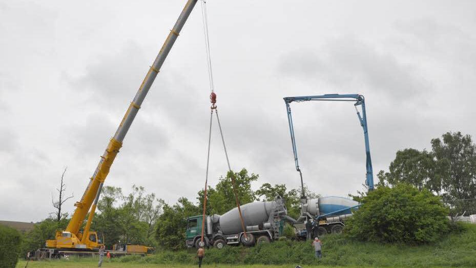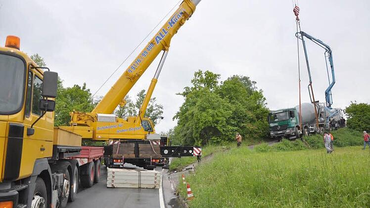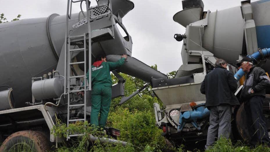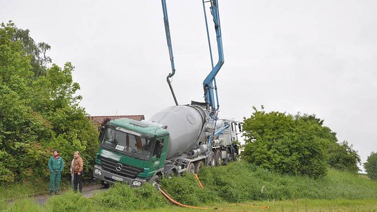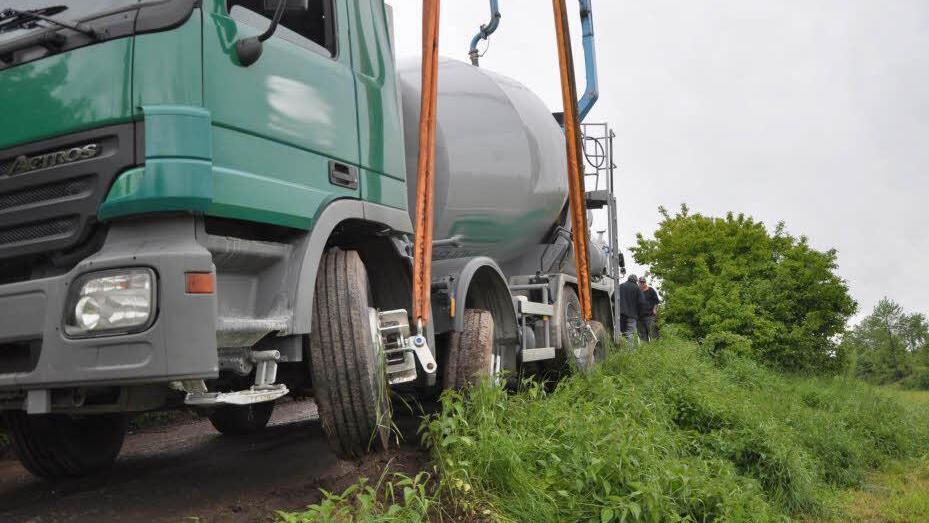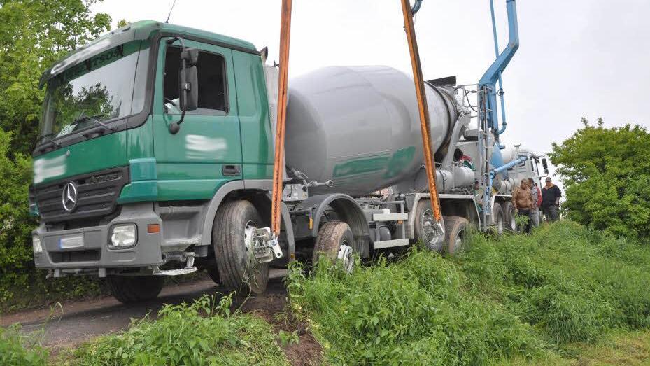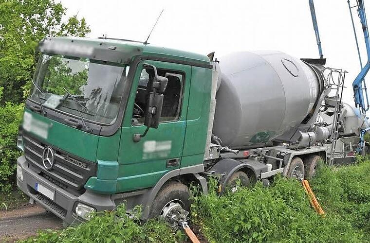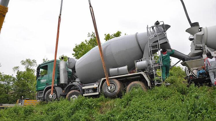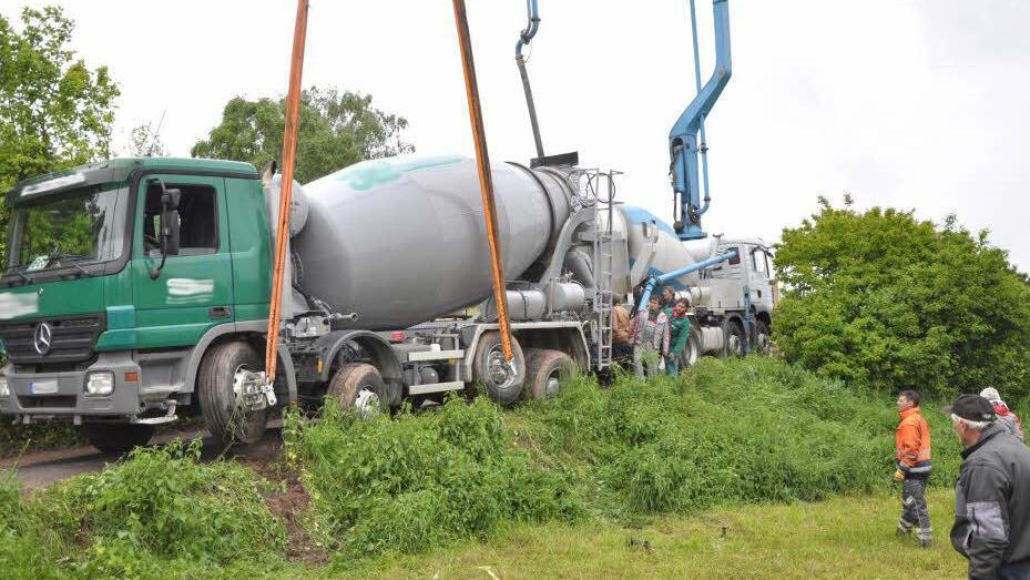 Als der Kran eintraf, der den Lkw wieder auf die Fahrbahn bringen sollte, gab es ein Problem: die Ladung des Lkw. Denn das Fahrzeug war bis zum Rand mit Beton gefüllt. Dieser musste zuerst umgepumpt werden, bevor der Lkw wieder auf die befestigte Fahrbahn gebracht werden konnte.