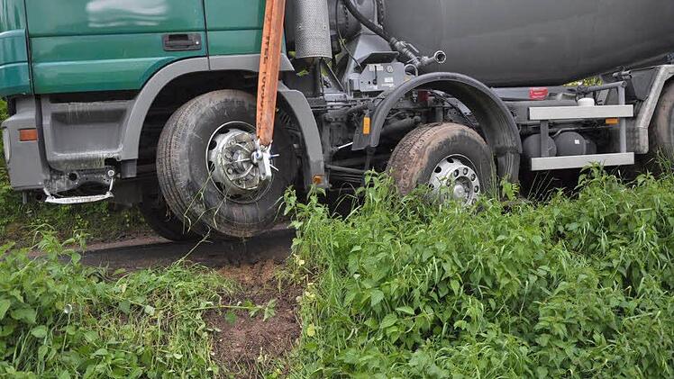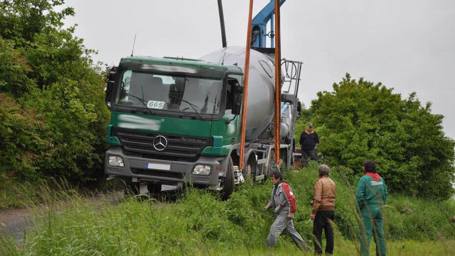 Ein Betonmischer ist am Montag in Münchaurach vom Weg abgekommen. Der Lkw drohte zu kippen. Ein Kran stellte das Fahrzeug wieder auf die Räder.