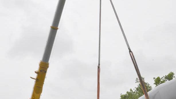Das Umladen des Betons ging jedoch nur, wenn der Lkw einigermaßen waagerecht stand. Kurzerhand wurde er durch den Kran auf der Fahrerseite an den Achsen hochgehoben, so dass der Beton, ohne großes Risiko, in ein bereits entleertes Fahrzeug umgefüllt werden konnte.