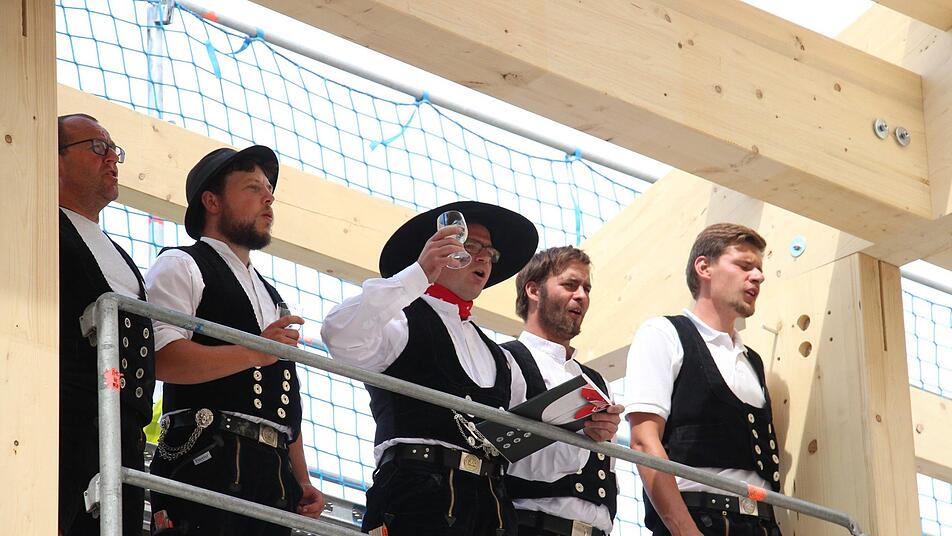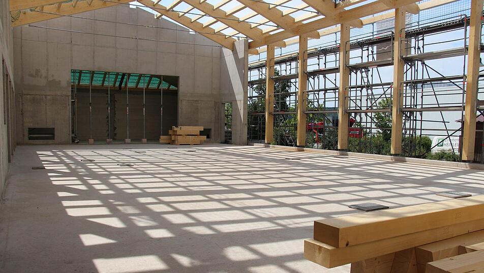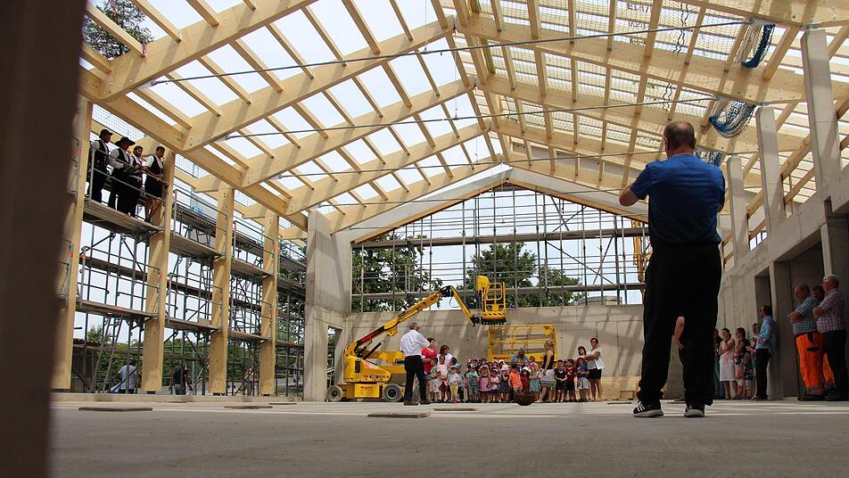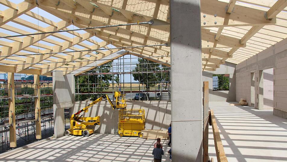 Ein paar Schritte weiter feierte man am Freitag Richtfest für den zweiten Schritt zur "neuen Mitte": die neue Mehrzweckhalle. Hauptsächlich für Schulsport, aber auch für Vereine und andere kulturelle Zwecke soll sie genutzt werden. Fertigstellung sei für Februar/März geplant, sagt Erich Popp, Architekt aus Herzogenaurach.