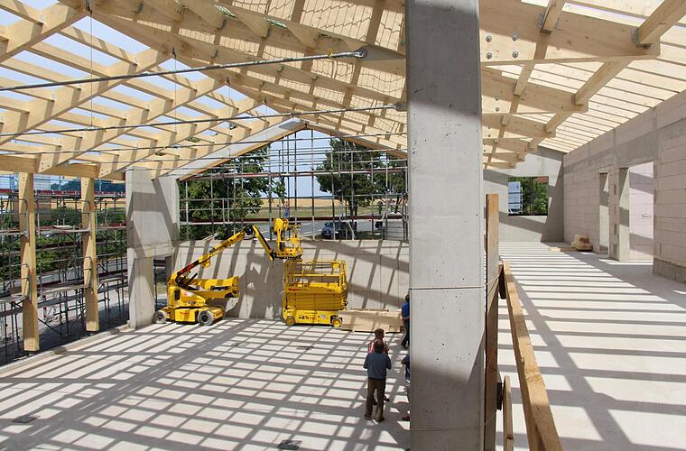 Funktionell wartet die Halle dann mit einer fest installierten, ein Meter hohen Bühne auf. Licht- und Tontechnik soll fest integriert sein. Es wird eine Cateringküche geben. Die bodentiefe Fensterfront nach Westen soll verdunkelbar werden.