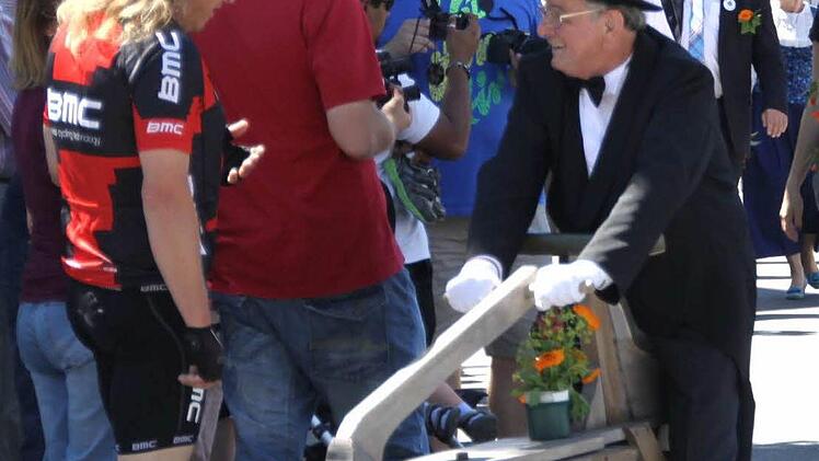 Ausländische Mitbürger laufen mit Besonders über die teilnehmenden ausländischen Mitbürger freute sich der Bürgermeister, "die gehören zu uns und es zeigt, dass sie sich in Weisendorf wohlfühlen." Natürlich erregten einige Gruppen schon besonderes Aufsehen, darunter die Firma Peter Brehm. Weisendorf hat zwar keinen Golfplatz, aber es fuhr ein Golfwägelchen mit und auf dem Anhänger radelt der durchtrainierte "Edgar Nr. 5", ein beliebtes Fotomotiv im Eingangsbereich der Firma Brehm. Ebenso bequem wie der Edgar Nr. 5 hatten es auch die ältesten Einwohner, sie durften in der Pferdekutsche mitfahren.