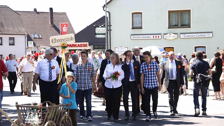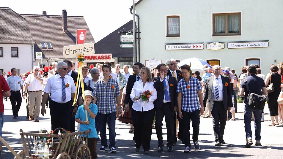 Mit einem Weckruf der Bläser und Böllerschüssen am Festplatz wurden die Weisendorfer zum Sonntag des 725-jährigen Jubiläums des Marktes Weisendorf geweckt. Schließlich stand mit dem Jubiläumsfestzug der Höhepunkt auf dem Programm. Dem Anlass angemessen, bewegte sich der lange Zug, angeführt durch Ehrengäste, Bürgermeister und Gemeinderat, singend, tanzend, marschierend und spielend durch den Ort.