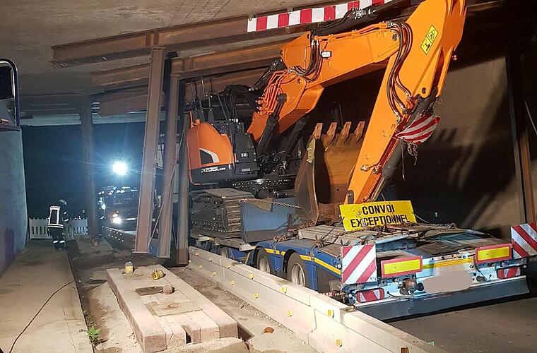 Der Sattelzug war mit einem aufgeladenen Bagger auf der Staatsstraße 2763 in Richtung Höchstadt a. d. Aisch unterwegs. Als der 33-jährige Fahrer mit dem Lkw unter der Autobahnbrücke an der Anschlussstelle Höchstadt-Nord durchfahren wollte, blieb das Gespann in der Brückenkonstruktion hängen.