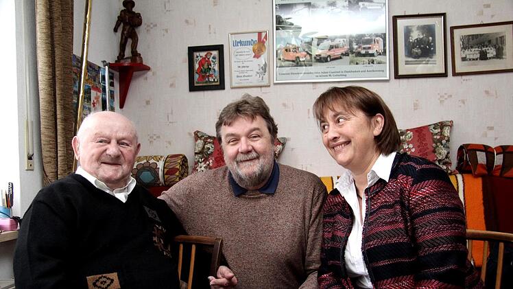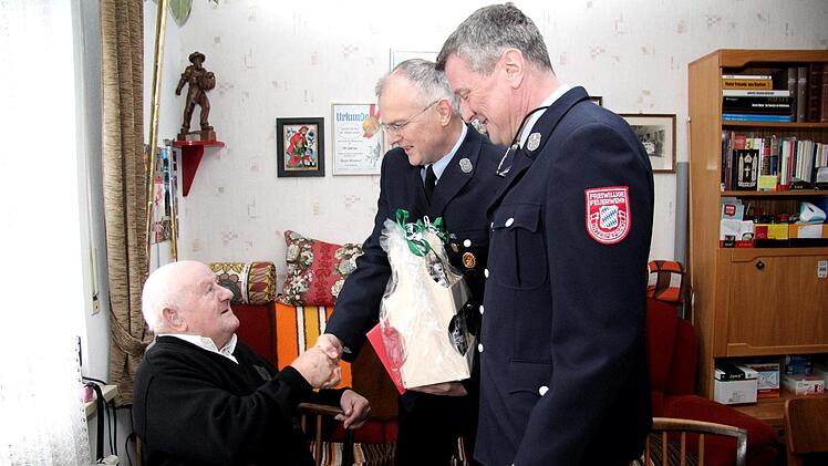 Natürlich gratulierten auch mit Kommandant Burkhardt Niepelt und dem Vorsitzenden Oliver Schüßler sowie Zweitem Bürgermeister auch die Feuerwehr des Heßdorfer Ortsteiles. Denn die Freiwillige Feuerwehr durchzog nahezu das ganze Leben des Jubilars. Seine aktive Dienstzeit begann bereits am 1. Juli 1939 und endete aus Altersgründen am 22. Januar 1989, damit schaffte Adam Gumbert inklusive des Reicharbeits- und Kriegsdienst 50 Jahre aktive Dienstzeit. So war er 25 Jahre Kommandant und Vorsitzender sowie Schriftführer der Membacher Feuerwehr und 21 Jahre Kreisbrandmeister des Unterkreises Seebachgrund, davon 17 Jahre als Schiedsrichter bei den Leistungsprüfungen im Landkreis Erlangen-Höchstadt unterwegs.