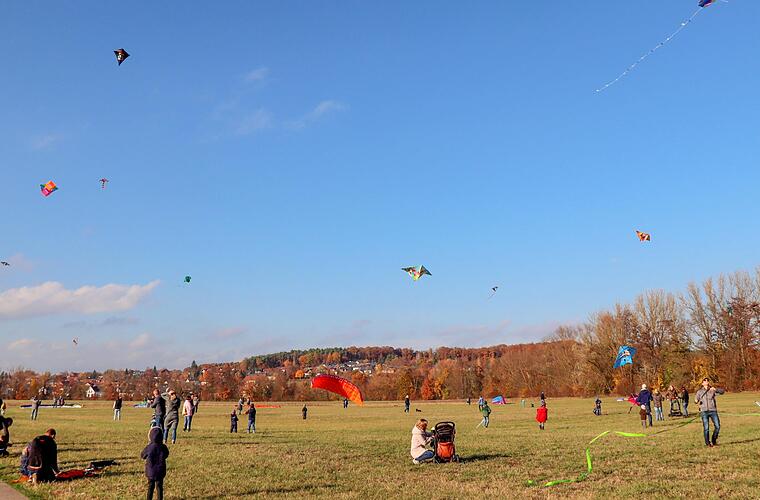 Letztes Jahr waren es 55 Drachen und diesmal ... die Spannung war groß. Am Ende waren 70 Drachen in der Luft und gut 250 Menschen auf den Aischwiesen! "Getoppt!", riefen alle Organisatoren glücklich.