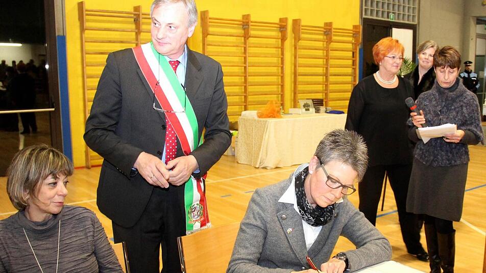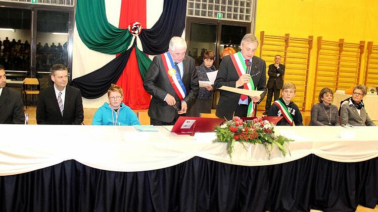 Als langjährige Freunde und Partner war auch eine kleine Delegation aus der deutschen Partnergemeinde Adelsdorf, angeführt von der Zweiten Bürgermeisterin Jutta Köhler (SPD), zum Festakt eingeladen. "Vive Uggiate, vive Ruaudin, vive Adelsdorf!" Mit diesem Hochruf beendete der Bürgermeister von Ruaudin, Alain Delafoy, seine Festrede am Samstagabend vor der feierlichen Unterzeichnung der Partnerschaftsdokumente.
