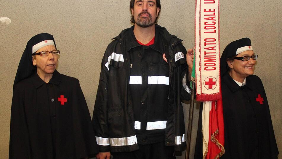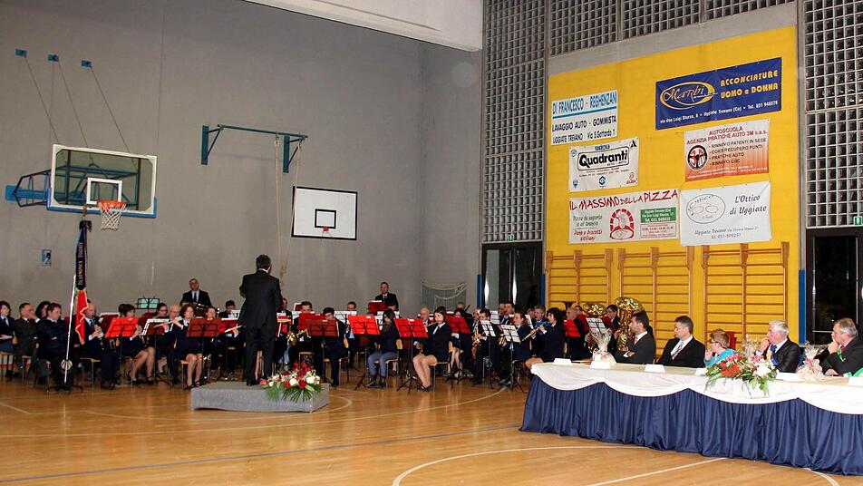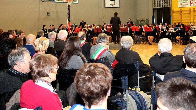 Nach dem Festgottesdienst in St. Peter und Paul zogen die Gäste bei strömendem Regen in einem ungezwungenen Festzug zur Turnhalle. Trotz der vielen zu berücksichtigenden Sprachen und des festlichen Anlasses war die Stimmung bei der Zeremonie gelöst, eine Tatsache, die viele Besucher auch den langjährigen Erfahrungen aus der deutsch-italienischen Partnerschaft zuschrieben - man weiß auf beiden Seiten inzwischen, dass es vor allem auf die zwischenmenschliche Komponente und das gemeinsame Erleben ankommt.