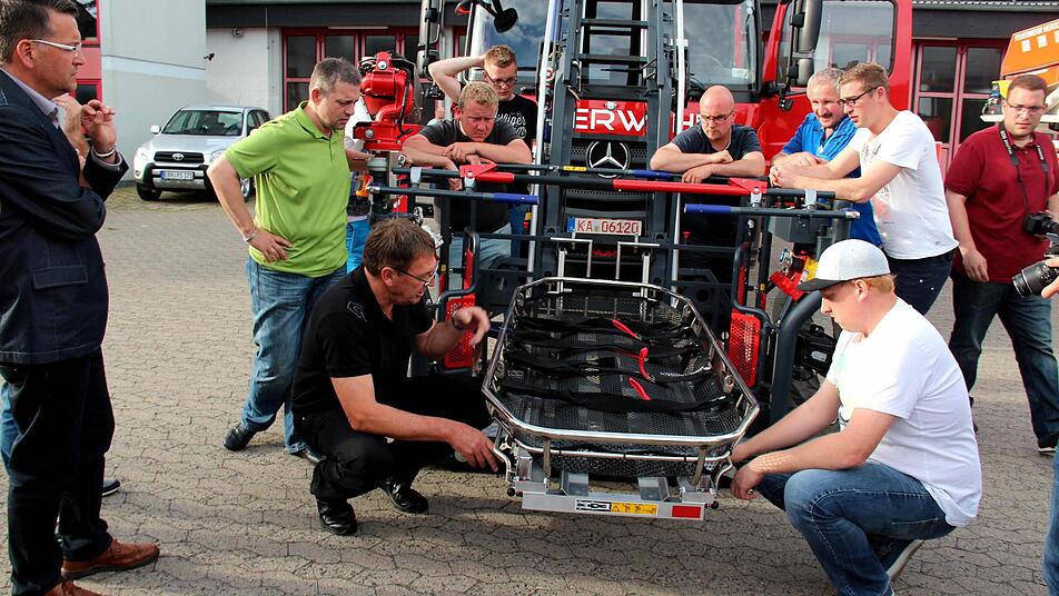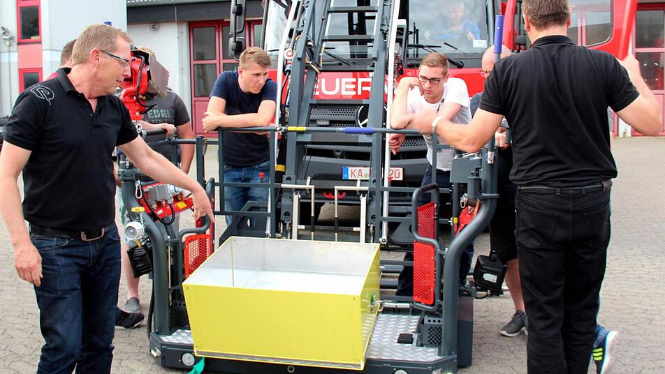 Fischkal meinte ganz trocken: "Was sein muss, muss sein. Wo heutzutage doch recht eng gebaut wird, ist so eine Gelenkleiter wirklich unerlässlich!" Alle bewunderten den beweglichen Multifunktionskorb, an den man eine normale Trage, eine Schwergewichtstrage, eine Vorrichtung für einen Rollstuhl oder eine Schuttmulde einhängen kann.