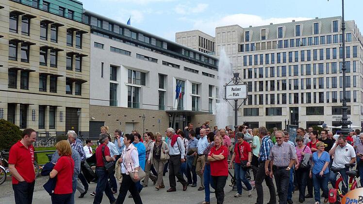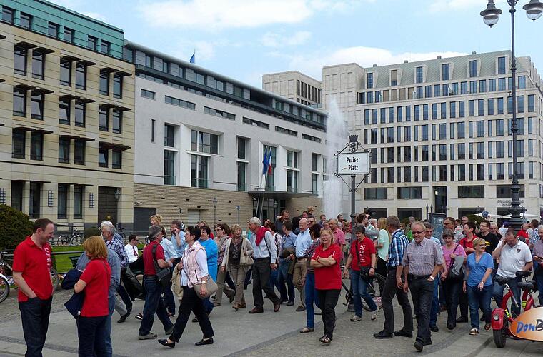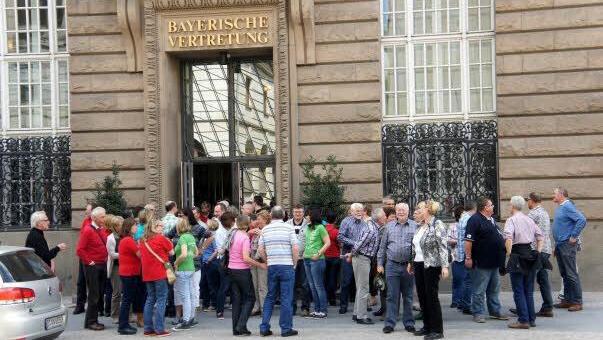 "Unser Bundestagsabgeordneter Stefan Müller (CSU) hatte die Einladung zu dieser Fahrt am Festabend des 125-jährigen Jubiläums ausgesprochen", erzählte Doris Kratz, die Schatzmeisterin des Vereins. "Es verging ein bisschen Zeit, aber nun hatten wir es endlich geschafft, sie einzulösen." Johannes Brehm, der "Vergnügungswart" des Vereins, hatte dann zusammen mit Stefan Müller das Programm erstellt. Das Interesse für die Reise war im Verein so groß, dass gleich zwei Busse gebraucht wurden. "Das war nur ein bisschen schade, weil wir natürlich nicht alles zusammen unternehmen konnten, meinte Inge Hörner, eine der Teilnehmerinnen. "Am Freitag waren wir gleich nach der Ankunft zum Mittagessen in der Bayerischen Landesvertretung zu Gast, anschließend ging's zum Pariser Platz, dem Brandenburger Tor und zur Holocaust-Gedenkstätte.