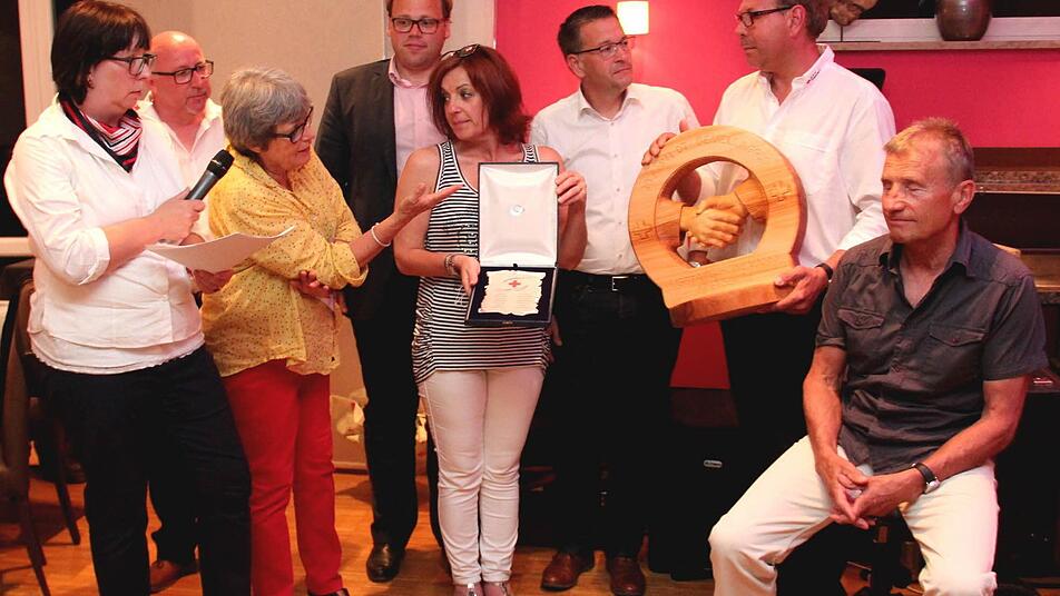 Viele der insgesamt 400 Adelsdorfer Rotkreuzler pflegen seitdem intensive persönliche Freundschaften und fast jedes Jahr finden gegenseitige Besuche statt. "Schritt für Schritt, Stufe für Stufe wird diese Partnerschaft weiter bestehen und wachsen.", so Pöschl zufrieden. "Viele schöne Erinnerungen reihen sich wie Perlen an einer Schnur.", fuhr sie fort. Das Geburtstagsgeschenk der BRKler brachte den ganzen Saal zum Staunen: Zwei Hände, die sich fest umschließen, eine Holzarbeit des Adelsdorfer Künstlers Franz Degenbeck. "Diese großartige Darstellung soll zeigen, dass der eine sich auf den anderen verlassen kann.", so Pöschl als Erklärung. Die italienische Einsatzleiterin von 112 Cristina Ghielmetti nahm solch ein meisterhaftes Geschenk gerne entgegen.
