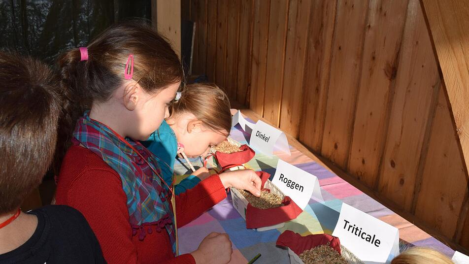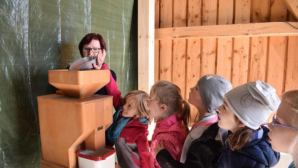 Unter Anleitung der Hofbesitzer Brigitte und Egid Dobeneck pressten die Schüler ihren eigenen Apfelsaft und freuten sich über den Duft von frisch gemahlenem Mehl. Für das eine oder andere Geruchserlebnis sorgten auch die Schweine des Bauernhofs. Zusammen mit den Hühnern übten diese besonders große Anziehungskraft auf die jungen Besucher aus.