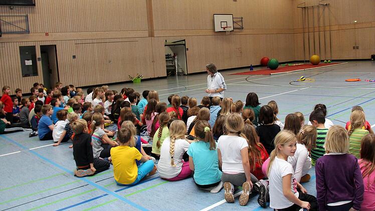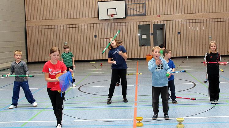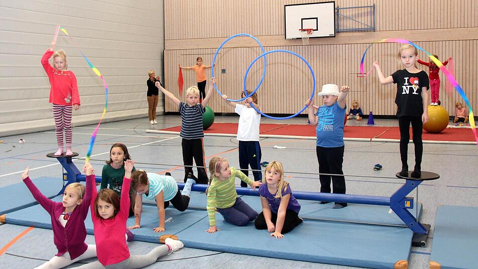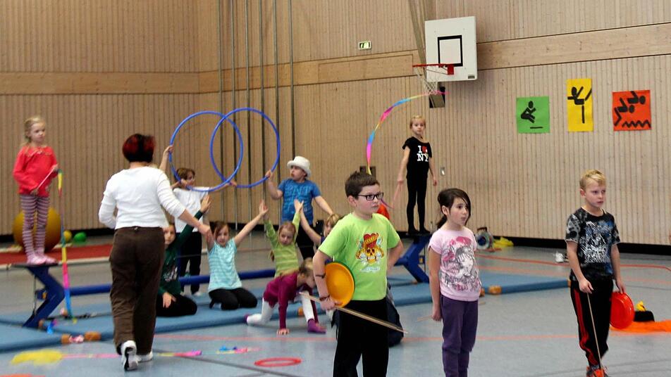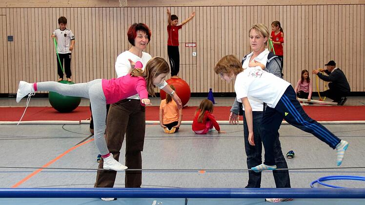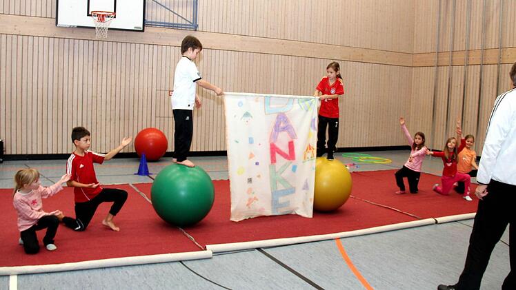 "Präsentieren ist das Wichtigste - auch wenn du runterfällst", ermahnt Gabriele Mönius, neben Konrektorin Rosi Wagner die Organisatorin, einen Schützling beim Balancieren auf einem großen Ball.