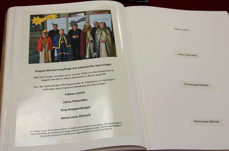 Stolz sind vier Adelsdorfer Sternsinger darauf, dass sie die Bundeskanzlerin in Berlin besuchen durften. Und darauf, dass sie sich jetzt im Goldenen Buch ihrer Heimatgemeinde verewigt haben. Auch das Sammelergebnis aller Adelsdorfer Sternsinger kann sich sehen lassen.