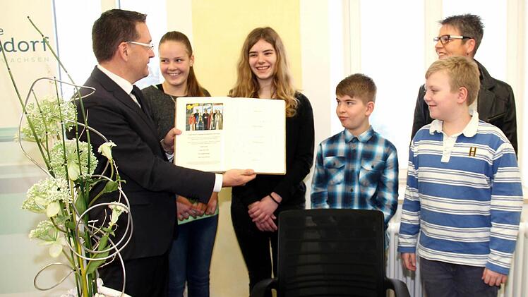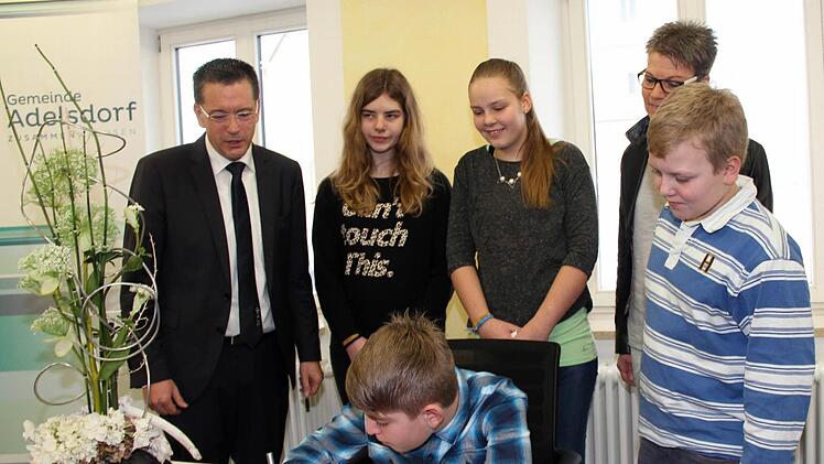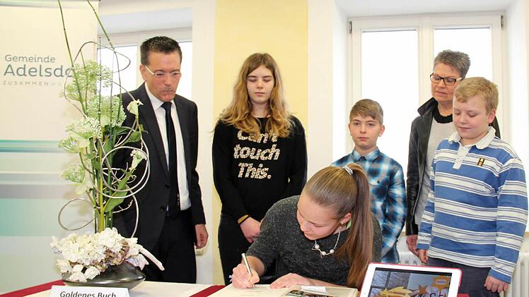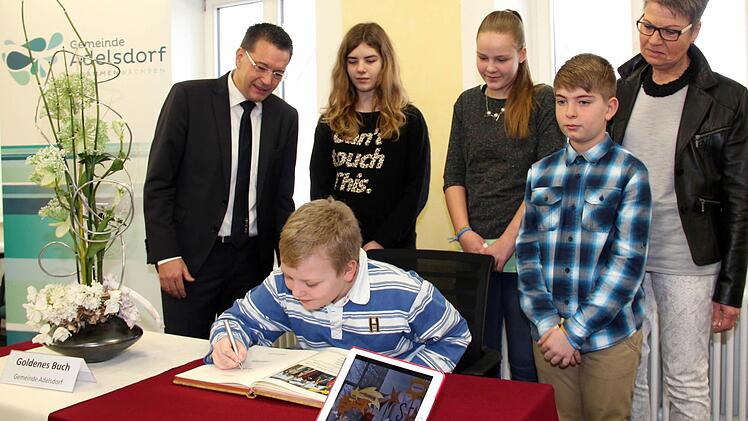 Am Samstag hat Bürgermeister Karsten Fischkal (FW) sein Versprechen vom Neujahrsempfang wahr gemacht. Anna-Lena Dittrich, Fabian Lamm, Tina Noppenberger und Julius Petersilka durften sich im Beisein der Eltern, der zweiten Bürgermeisterin Jutta Köhler (SPD) und Pastoralreferentin Dagmar Haas ins Goldene Buch der Gemeinde Adelsdorf eintragen.