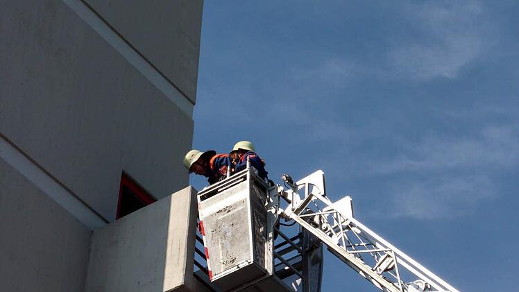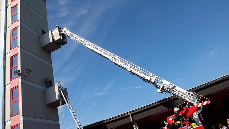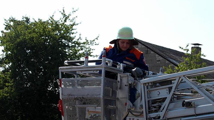 Jungfeuerwehrmann Fabian wurde mittels einer Fahrzeugleiter aus einer Höhe von 14 Metern - vom Balkon des Schlauchturms - von Jungfeuerwehrfrau Lisa gerettet.
