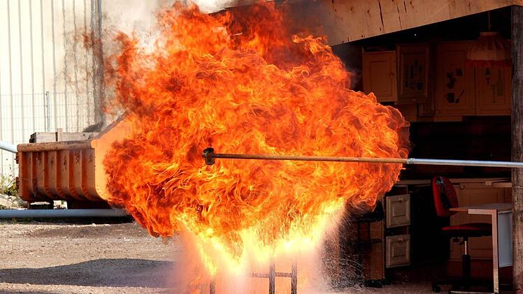 Was passiert, wenn man mit Wasser löscht, demonstrierten die Feuerwehrmänner, und der Schreck saß tief, als ein riesiger Feuerball über der Pfanne aufzischte.