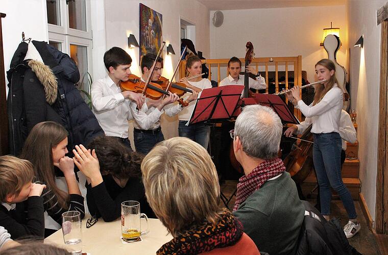 Ein Highlight gab es im "Töpfla", das bereits am frühen Abend proppenvoll war. "Eine Weltpremiere", wie Mirjam Wellein verkündete. Die Wirtin der Kultkneipe hatte sechs Musiker gewinnen können, die sich in dieser Formation zum ersten Mal vor Publikum präsentierten. Anzunehmen, dass man von Jesko Fröhlich, Dominik Schwägerl, Laura Zinn, Lorenz Polifke, Ronald und Henrike Fröhlich noch mehr hören wird. Ihr Repertoire reichte von Klassik, Rock und Pop bis hin zu eigenen Kompositionen.