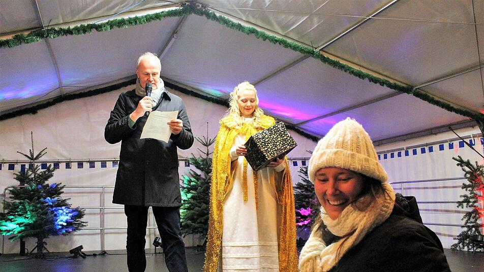 Gegen 20 Uhr betrat das Höchstadter Christkind zusammen mit Bürgermeister Gerald Brehm (JL) die Bühne. Ihnen kam die Aufgabe zu, die Gewinner des Engelspfad-Gewinnspiels zu ziehen.