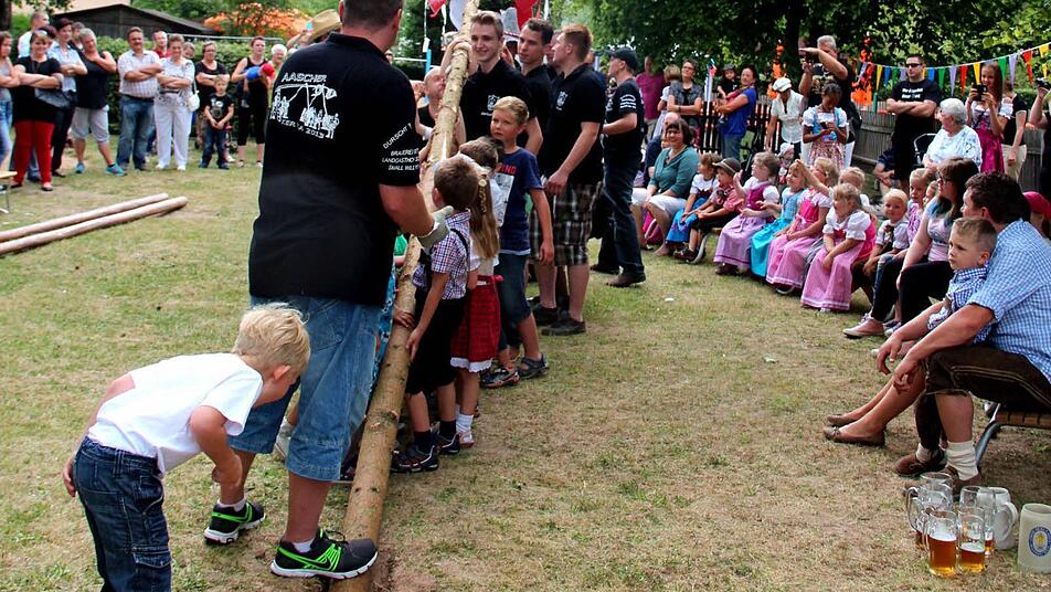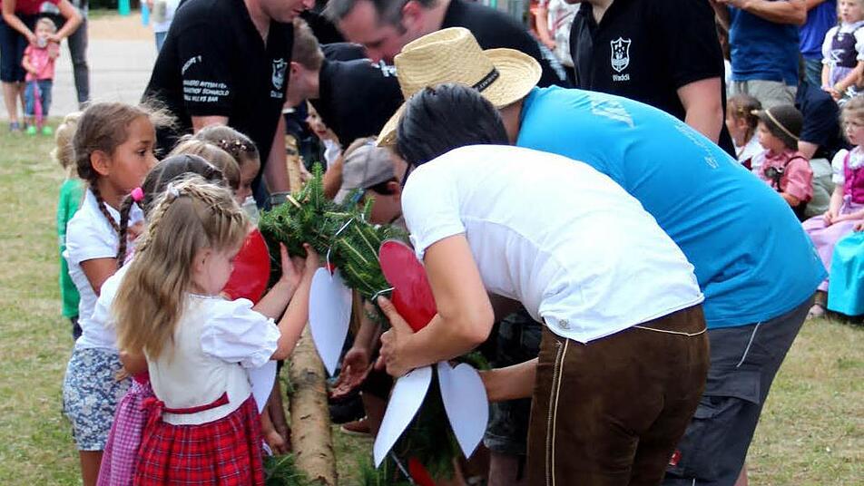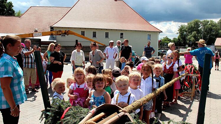 Die Vorschulkinder, die sich sicher waren, dass dies der größte Kerwasbaum sei, den sie je gesehen haben, waren eifrig beim Aufstellen dabei. Nach dem gelungen Fassanstich - im Fass war Apfelsaftschorle - durch Bürgermeister Karsten Fischkal (FW) und der Ankunft von Pfarrer Thomas Ringer klarte der Himmel aber schon wieder auf, und die Sonne lachte herunter auf das Kerwastreiben.