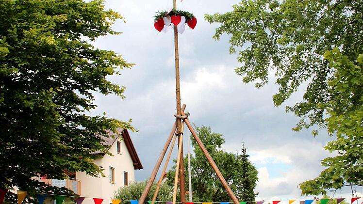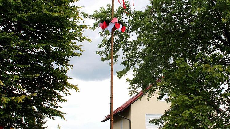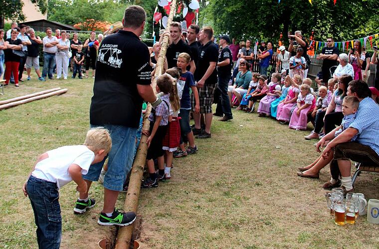 Anfangs schien die Sonne. Jedoch beim Baumaufstellen spülten die Regentropfen gleich den Schweiß aus den Gesichtern der eifrigen großen und kleinen Burschen und Madla. Matthias Mönius hatte die Oberaufsicht beim Baumaufstellen, und mit vereinter Anstrengung von Groß und Klein war der Baum nach einer halben Stunde fest im Boden verankert.