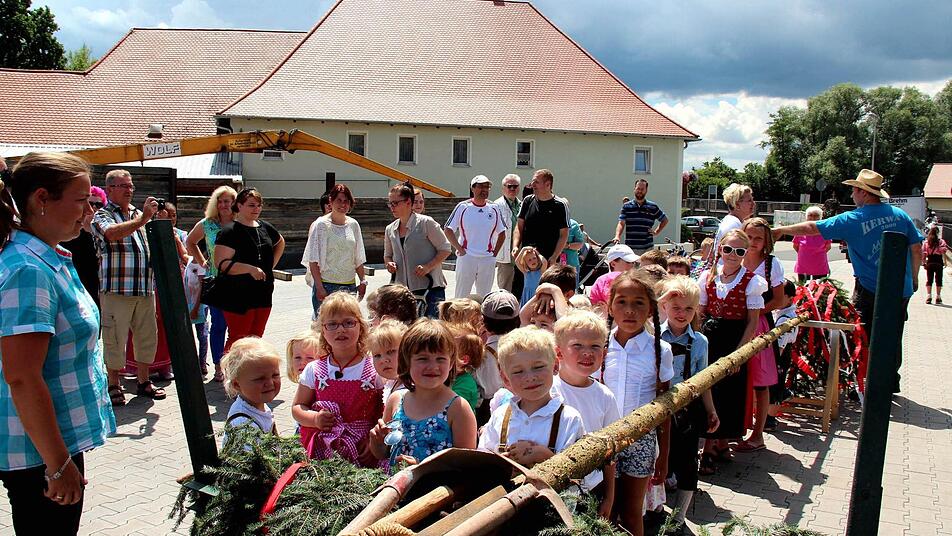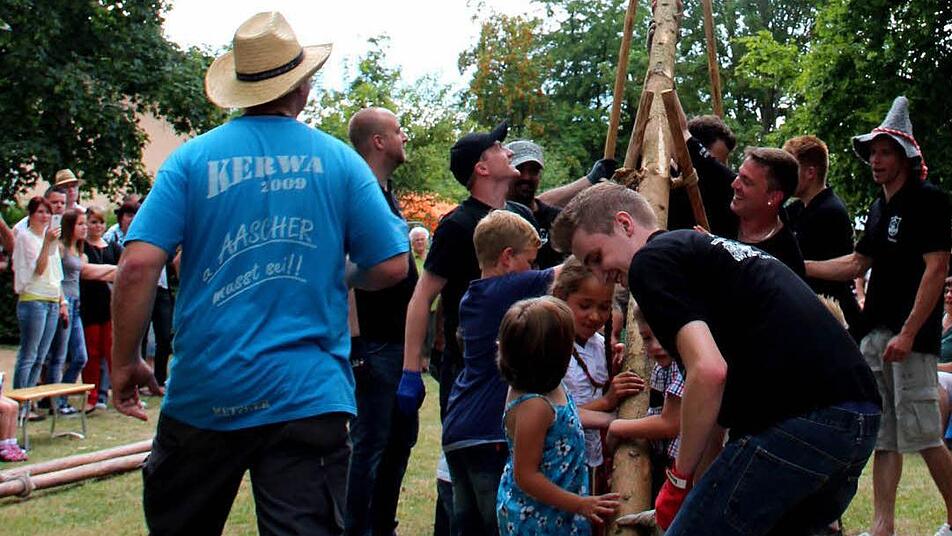 Extra jugendfreie Kerwasliedla sangen am Samstagnachmittag die "Aascher" Kerwasburschen zusammen mit den Kerwasbürschla und den feschen Kerwasmadla vom Kindergarten St. Theresia in Aisch, während sie mit einem etwa zehn Meter langen Kerwasbaum von der Aischer Mühle zum Kindergarten zogen. es wurde das 25. Jubiläum des Kindergartens St. Theresia gefeiert.
