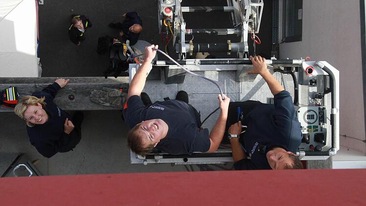 Wer von den Älteren mutig genug war, nutzte die Chance mal auszutesten, ob man selbst feuerwehrtauglich ist. Knapp 20 Meter ging es die Drehleiter hinauf, nicht automatisch per Tragekorb, sondern selber per pedes die Stufen. Auch hier galt es für manchen seine Überraschung laut kund zu tun. "Ich habe es gerade so geschafft", meinte der 32-jährige Niederndorfer Oliver Gehr. "Dass die echten Feuerwehrmänner und -frauen da mit Atemschutz hochgehen, mag ich gar nicht glauben..."
