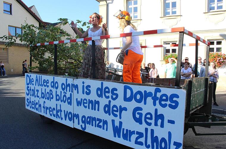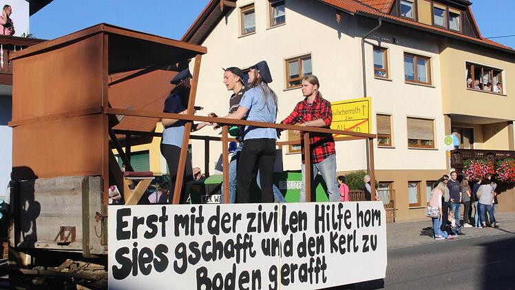 Höhepunkt der Kirchweih war der Umzug am Sonntagnachmittag. Dazu hatten sich zahlreiche Schaulustige entlang der Hauptstraße eingefunden. Auf acht Motivwägen hatte die Jugend Ereignisse und "G'schichtla" aus dem Dorfgeschehen aufs Korn genommen. "Mein Freund der Baum ist tot", jammerte lautstark eine Anwohnerin aus dem Wachenrother Baugebiet. Von zwei alkoholisierten jungen Damen erzählte ein anderer Wagen. Die beiden Kirchweihgängerinnen wähnten sich bereits in Eckersbach, landeten aber zwischen Kühen in Thüngfeld.