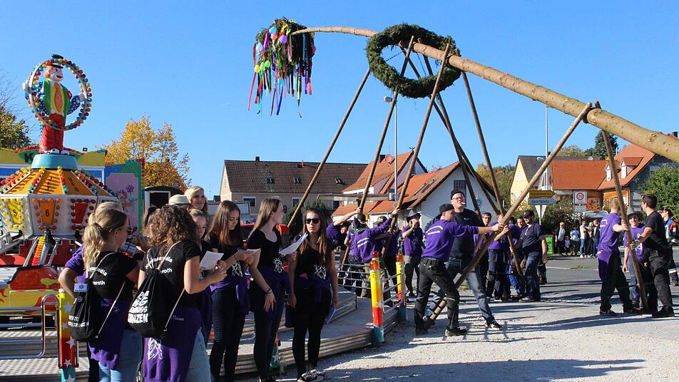 Die Wachenrother Kerwasmadla sangen die frechen alten Kerwaslieder. Die Burschen wuchteten indes unter Aufwendung aller Kräfte den stattlichen Baum in die Höhe. Geschmückt hatten sie ihn mit einem Kranz, bunten Bändern und Luftballons.