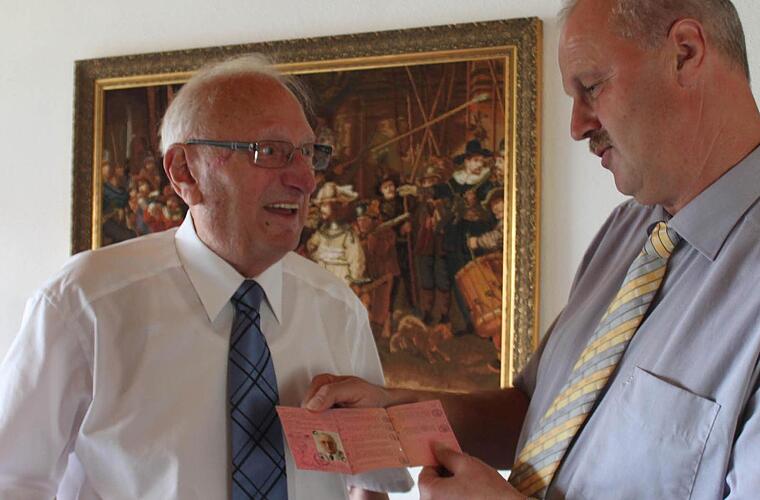 So einen kurzen Dienstweg erlebt Bürgermeister Gerald Brehm (JL) auf Gratulationsbesuch nicht alle Tage. "Mit 90 gebe ich meinen Führerschein ab", verkündete Heinrich Kestler an seinem Geburtstag im vergangenen Jahr. Und er hat sein Versprechen gehalten. Ein bisschen schwer falle es ihm schon, "aber gesagt ist gesagt", meint der rüstige Jubilar und überreicht gestern dem Bürgermeister den Schein.