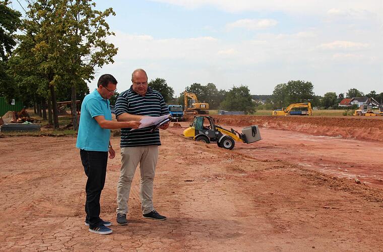 Am Reuthsee, einem Gebiet zwischen Bahnhofstraße und Wiesendorf, entsteht derzeit das größte je geplante Baugebiet der Gemeinde Adelsdorf. Bürgermeister Karsten Fischkal (FW) und Bauamtsmitarbeiter Thomas Wolff machten sich ein Bild von der Erdarbeiten, die vor Kurzem begonnen haben.