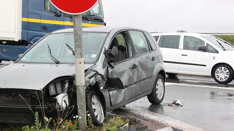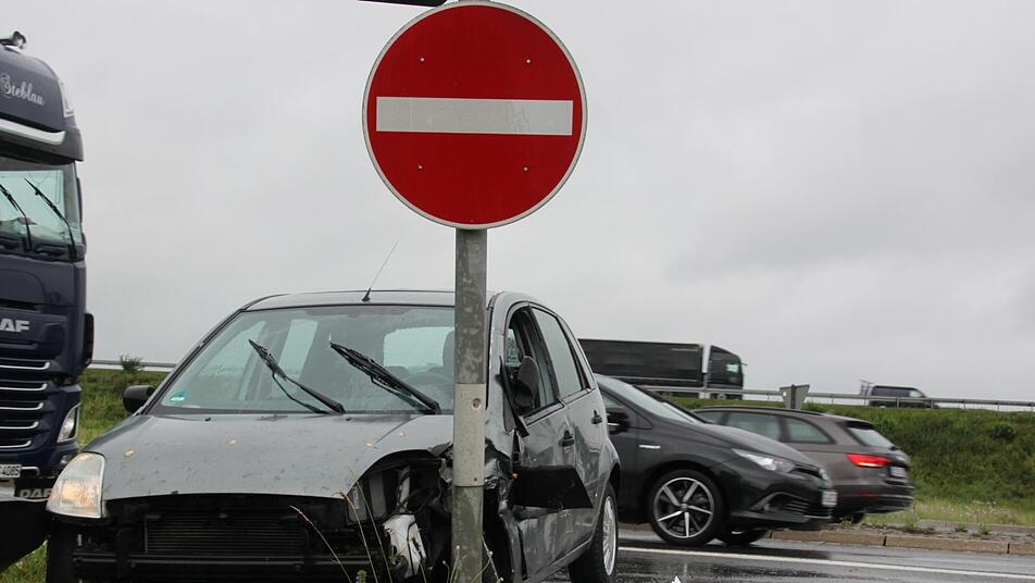Der Ford schleuderte in ein Fahrschulauto, das von der Rampe kommend an der Kreuzung stand. Anschließend rutschte der Ford wenige Zentimeter an einem weiteren Auto vorbei und landete am Ampelmast. Der Transporter und der Ford mussten abgeschleppt werden.