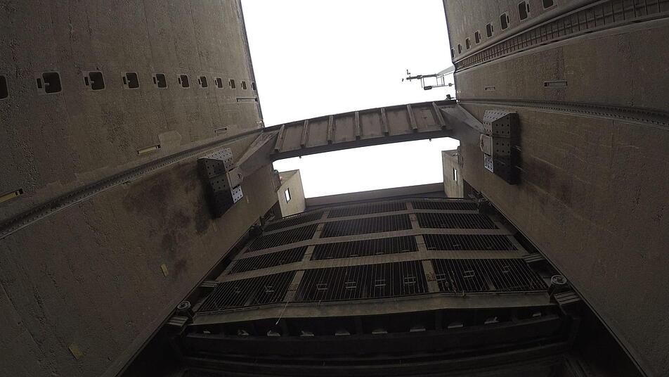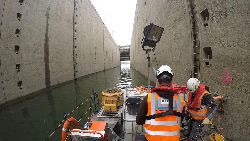 Eng geht es dort zu. Die Arbeiter tragen Rettungswesten. Denn unter der Wasseroberfläche geht es noch einmal vier Meter tiefer bis zum Grund der Schleuse.