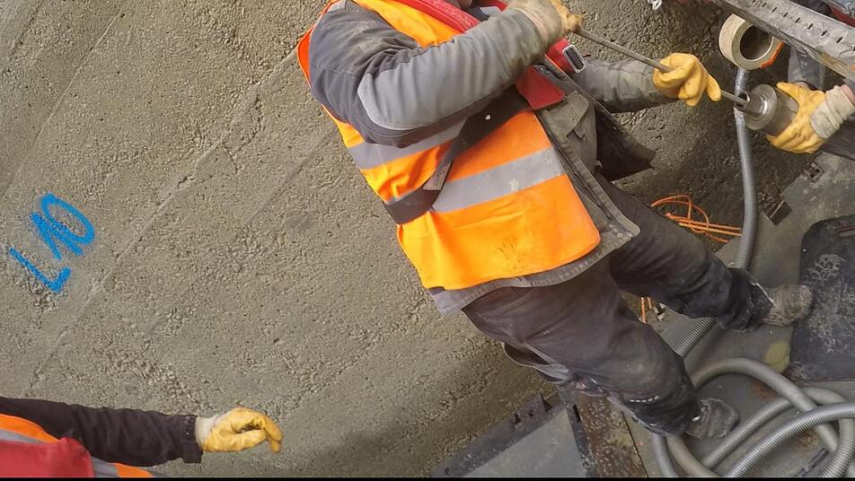 Die Wände der Schleuse werden nun verstärkt. Die Arbeiter bohren Löcher, um stabilere Stäbe aus Bewehrungsstahl einzufügen.