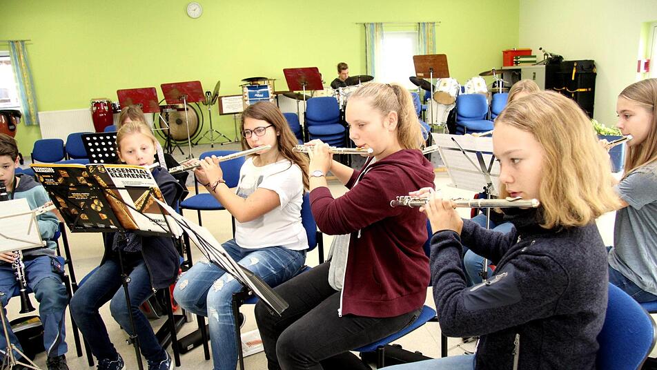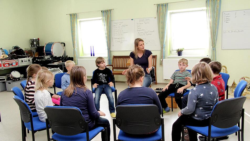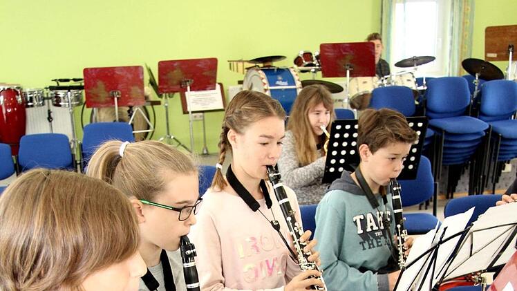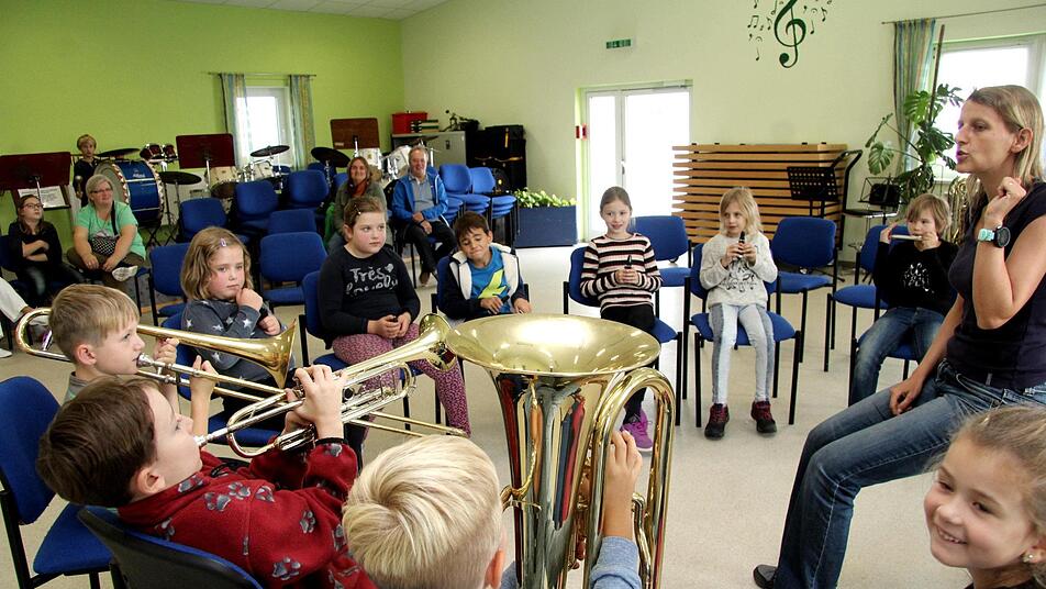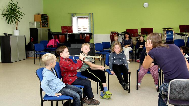 Eine Woche vorher warb die Ausbilderin und Dirigentin des Nachwuchsorchesters, Christine Pölloth, in der Grundschule um Kinder für die Bläserklasse. Acht "Schnupperkinder" kamen zum Tag der offenen Tür und entlockten den Instrumenten erste Töne. Die Dirigentin begann mit rhythmischen Übungen und gesungenen Versen, bevor die Wunschinstrumente verteilt wurden.